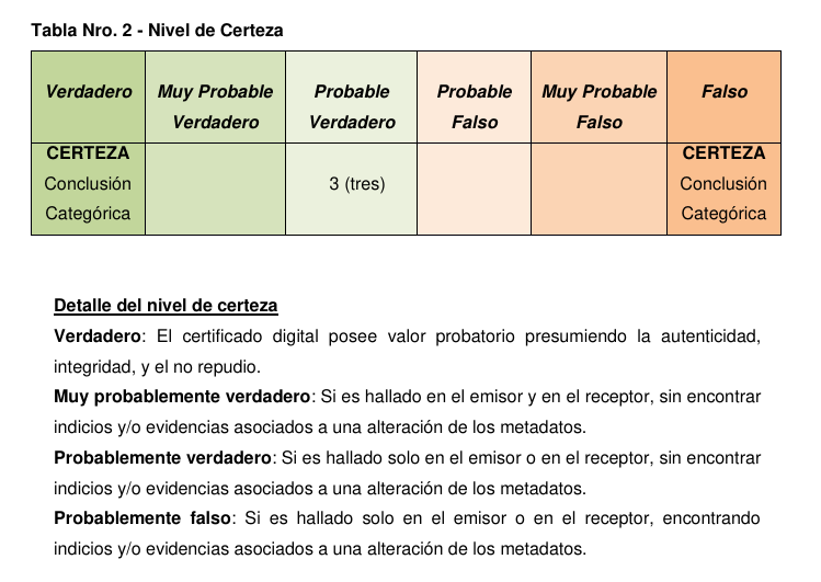 Escala de Certeza (Ponderación): Ante la falta de una conclusión «categórica», el perito aplicó una «Tabla de Nivel de Certeza». Bajo este criterio, clasificó los correos relevantes como «Probablemente verdaderos». Esta calificación se asigna cuando la evidencia es hallada en una sola de las partes (en este caso, la actora) pero no presenta signos de alteración técnica.