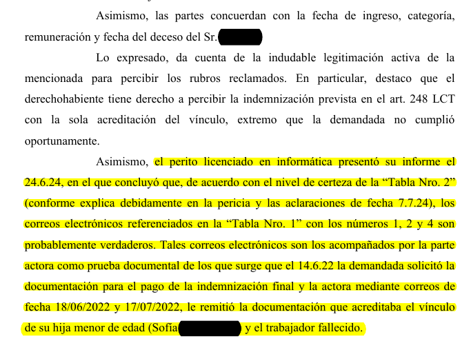 El litigio se origina a partir de la demanda interpuesta por la actora, en representación de su hija menor, contra Telecom Argentina S.A.. La actora reclamó el pago de la indemnización por fallecimiento (Art. 248 LCT) de Diego S, padre de la menor, alegando que la empresa, a pesar de haber recibido la documentación que acreditaba el vínculo familiar mediante correos electrónicos en 2022, se negó a abonar lo adeudado. Por su parte, la demandada sostuvo que la actora nunca acreditó fehacientemente dicho vínculo, lo que justificaba la falta de pago hasta que finalmente depositó la suma judicialmente en 2023, una vez iniciado el proceso.