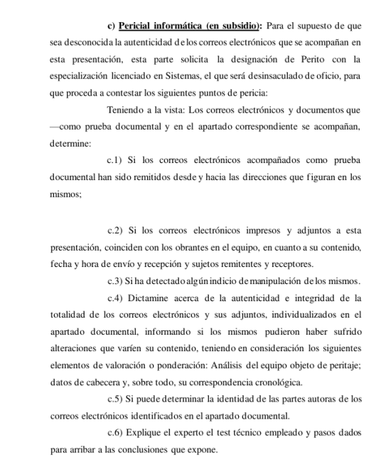 Ante el desconocimiento de la autenticidad de los correos electrónicos por parte de la demandada, se designó al perito Fabián Abel Rocha para dictaminar sobre la integridad y autoría de dichas comunicaciones.